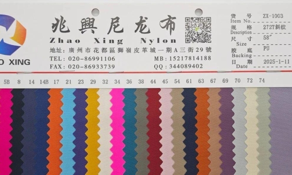 货号:ZX-1003规格:272T斜纹成分:100%尼龙尺寸:58”克重:125g/㎡厚度:0.19mm胶底:PU尼龙材质尼龙本身具有高强度、耐磨、耐撕裂、弹性好等特点。这使得该布料在使用过程中能够承受较大的外力和摩擦,不易损坏,适合制作需要长期使用且经常受力的产品,如背包、帐篷等。斜纹组织272T的斜纹结构,相比平纹
