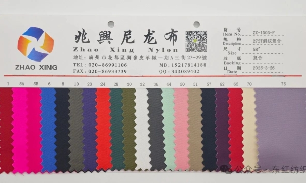 货号:ZX-2001规格:200D暗格成分:100%尼龙尺寸:58”克重:114g/㎡厚度:0.18mm胶底:PU二、材质特性与优势200D暗格结构200D暗格编织使面料呈现细腻格纹肌理,增强经纬向交织密度,赋予面料抗拉伸、抗起球性能,裁剪后箱包版型挺括,视觉上增添精致感与立体感,适配追求细节设计的箱包产品。200D材