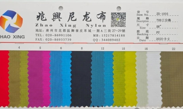 货号:ZX-1005规格:70D三分格成分:100%尼龙尺寸:58”克重:70g/㎡厚度:0.13mm胶底:PU材质特性与优势尼龙材质尼龙本身具有高强度、高韧性的特点,这款70D的尼龙布更是在保持轻便的同时,具备出色的抗撕裂性能,能承受箱包在装载物品、搬运过程中的各种拉力和压力,有效保护箱包内的物品安全。三分
